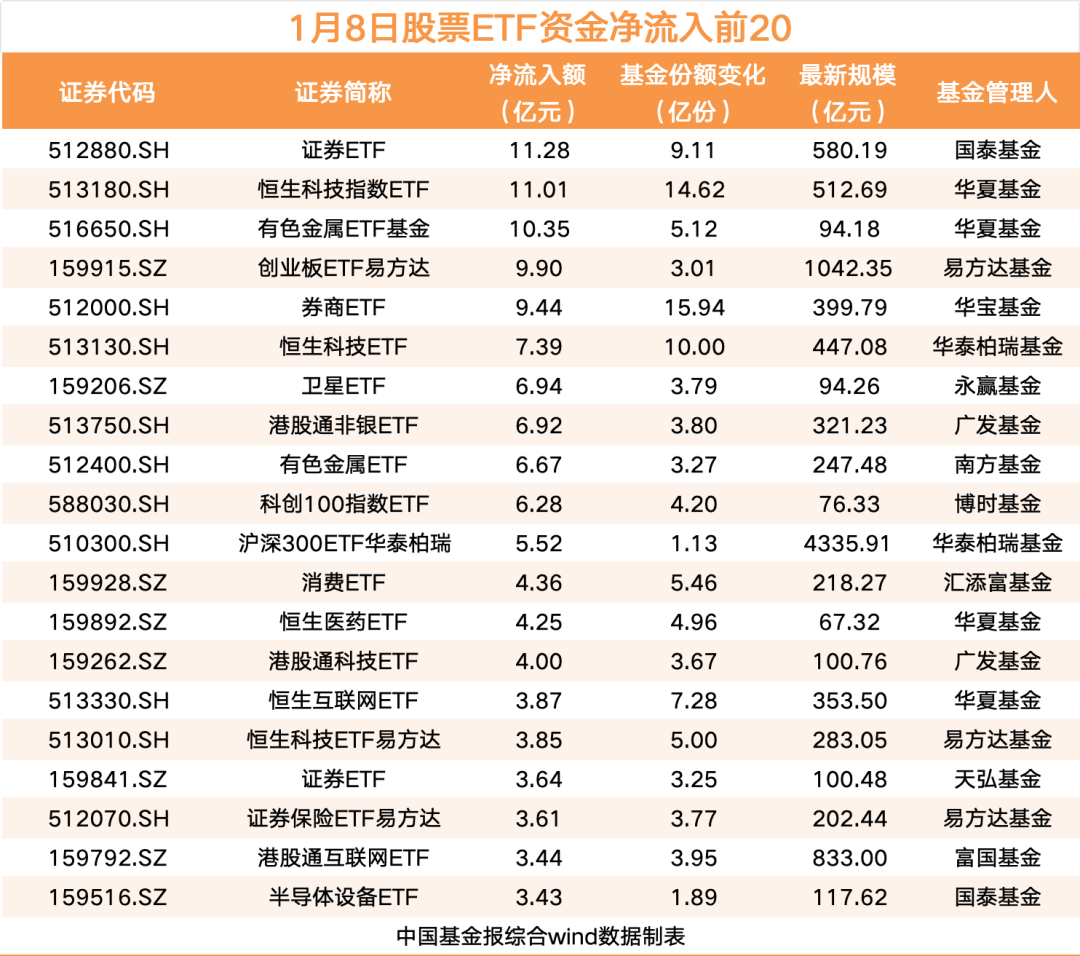 1月8日,A股三大指数集体收跌。股票ETF市场上,资金开始加仓,当日资金净流入超46亿元。