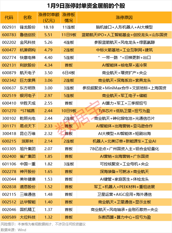 涨停股中,ST中迪、*ST亚太等15只股为ST股。从连续涨停天数看,锋龙股份已连收11个涨停板,连续涨停板数量最多。从收盘涨停板封单量来看,杭萧钢构最受资金追捧,收盘涨停板封单有13306.90万股,其次是利欧股份、棕榈股份等,涨停板封单分别有5820.83万股、4322.87万股。以封单金额计算,锋龙股份、鲁信创投、金风科技等涨停板封单资金较多,分别有18.18亿元、5.51亿元、5.26亿元。