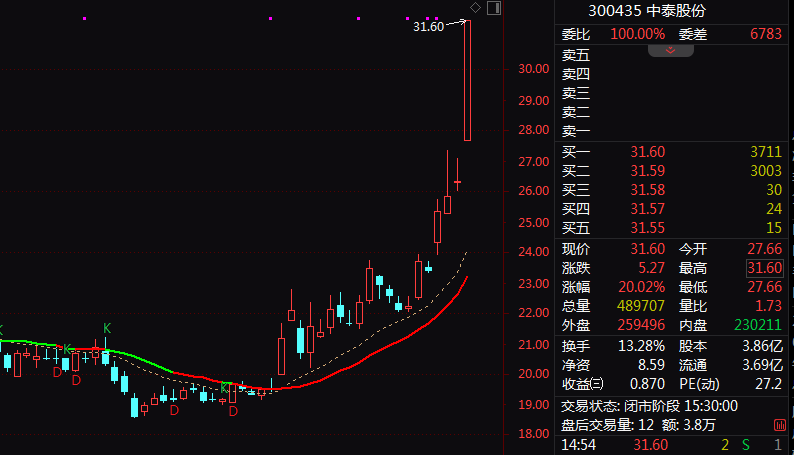 业绩预增股午后走强,中泰股份(300435)午后开盘后放量直线20%涨停,股价创10年新高(复权),成交14.6亿元,创4年新高。