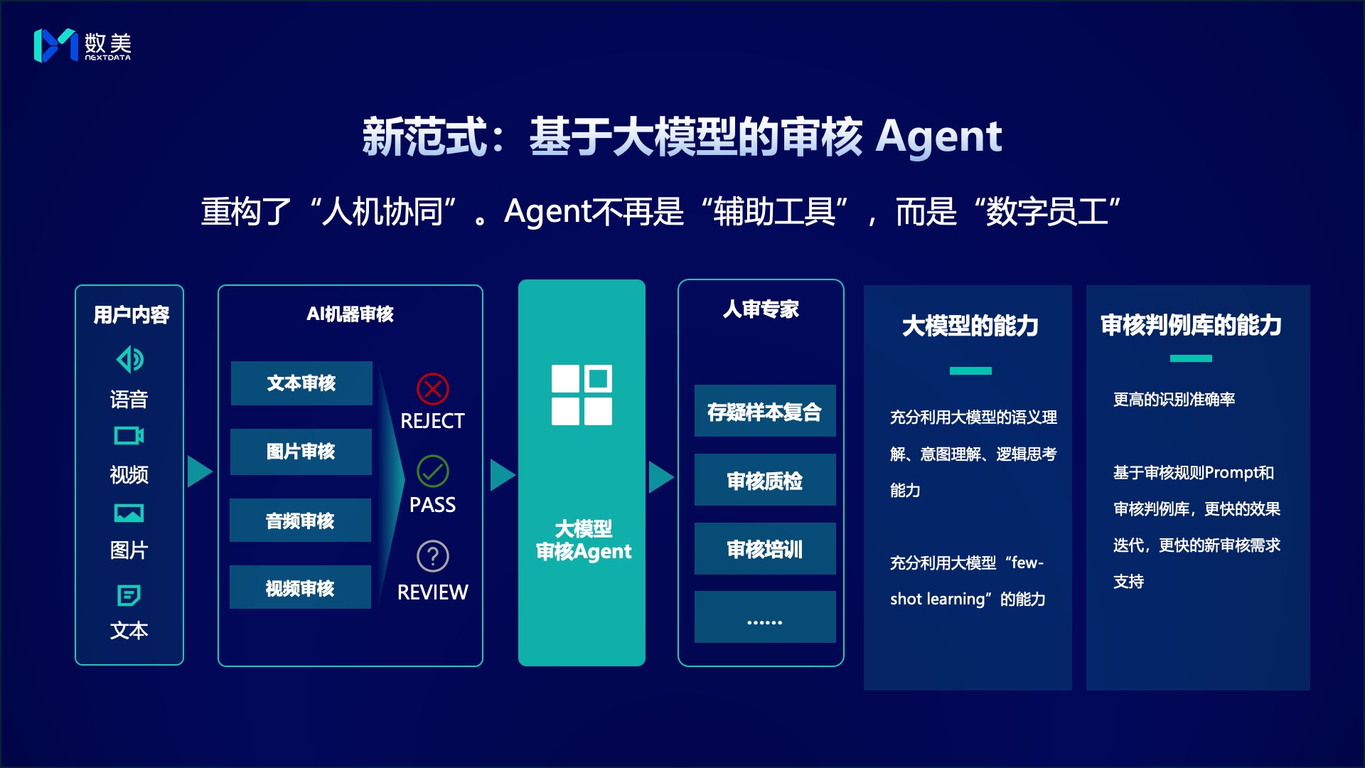2025年下半年,数美科技发布了以“大模型审核Agent”为核心的AI风控产品体系,将风控体系更新为“AI机器审核+大模型审核Agent+专家决策”。