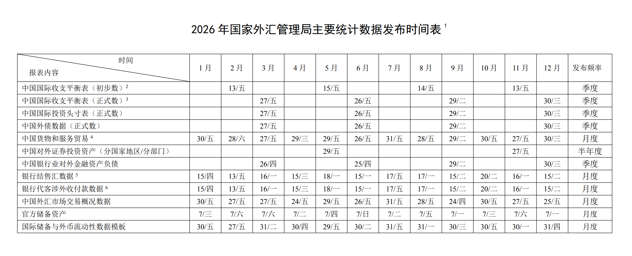 人民财讯1月13日电,为进一步方便社会公众获取国际收支及相关数据,国家外汇管理局现公布《2026年国家外汇管理局主要统计数据发布时间表》。