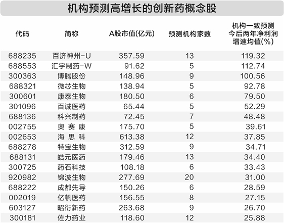 从未来增长潜力来看,证券时报·数据宝根据5家及以上机构一致预测,2026年、2027年净利润增速均有望超20%的创新药概念股有23只。