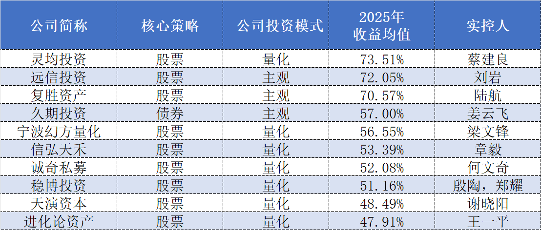 量化巨头灵均投资以高达73.51%的收益均值,成为2025年百亿私募收益总冠军。