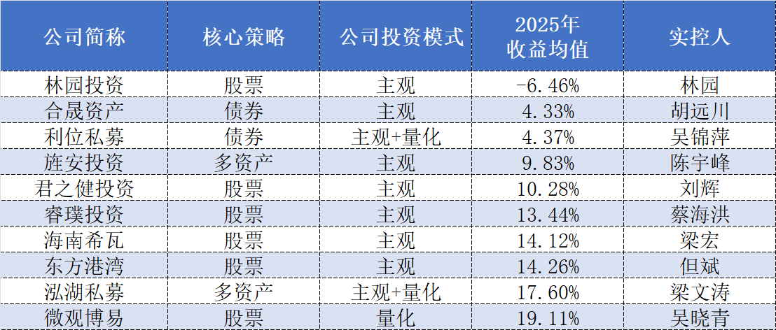 也有部分百亿私募2025年的收益表现不尽如人意。其中,排在后十位的百亿私募2025年的收益均值均不足20%,按照投资模式划分,有7家为主观私募,2家为主观+量化私募,仅1家为量化私募。