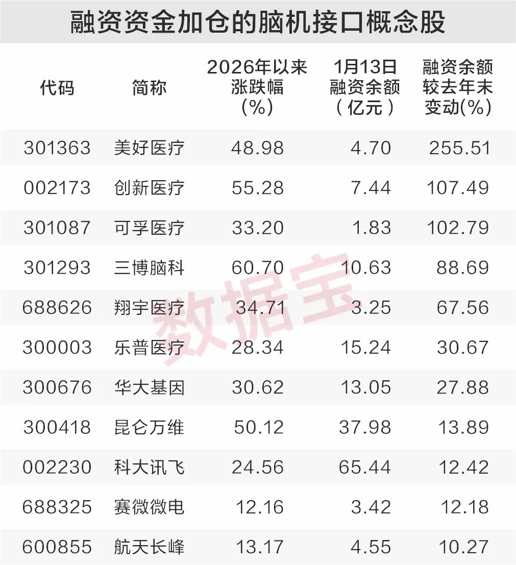 从融资资金来看,据证券时报·数据宝统计,截至1月13日,万得脑机接口26只概念股中,有19只属于融资融券标的,最新融资余额合计近255亿元,与去年末相比增加超过15%,其中17只个股获加仓,11只加仓幅度超过10%。