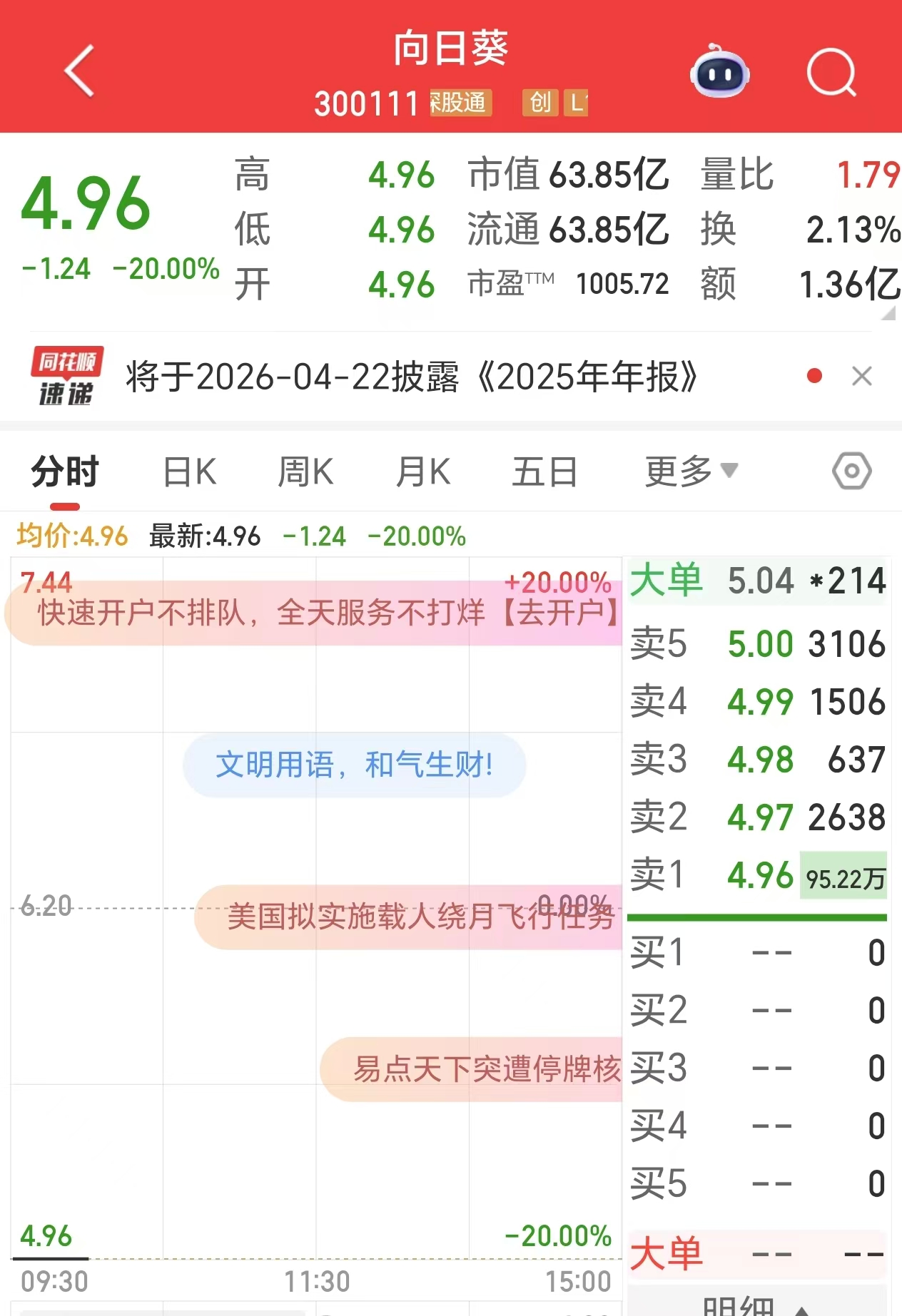 1月15日,向日葵(300111.SZ)开盘跌停。截至发稿前,该股报4.96元/股,市值为63.85亿元。