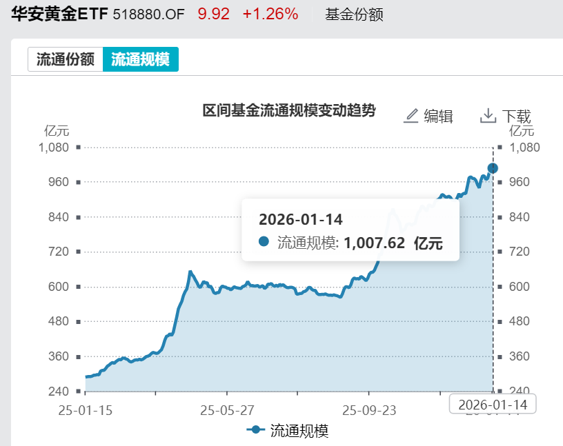 截至1月14日,华安黄金ETF最新份额达101.62亿份,规模迈上千亿元大关,达1007.62亿元,创下历史新高。
