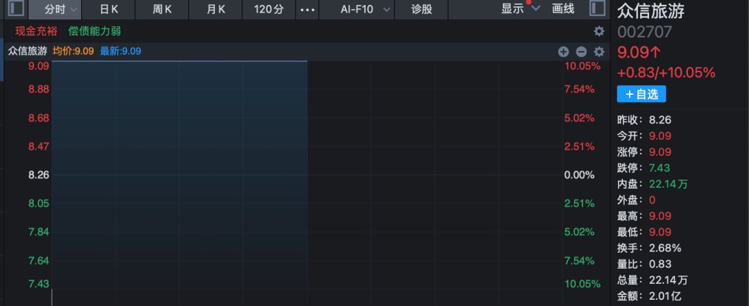 旅游股早间逆市高开高走,板块指数盘中大涨逾2%,创近4个月来新高。众信旅游开盘一字涨停,连续第2日封板,陕西旅游临近午间收盘最后7分钟直线涨停,西安旅游、长白山、云南旅游等也均在临近午间收盘前几分钟出现直线拉升的走势。