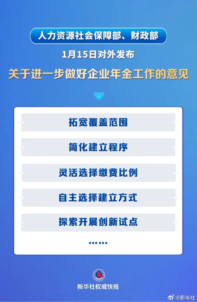 1月15日,人力资源社会保障部、财政部对外发布关于进一步做好企业年金工作的意见,增强企业年金制度的包容性、灵活性和便捷性,持续推动扩大覆盖范围,让更多职工享有企业年金。