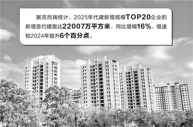 2025年,代建新拓规模逆转了2024年拓展“失速”的态势。据克而瑞统计,2025年代建新增规模TOP20企业的新增签约建面达22007万平方米,同比增幅16%,增速较2024年提升6个百分点。