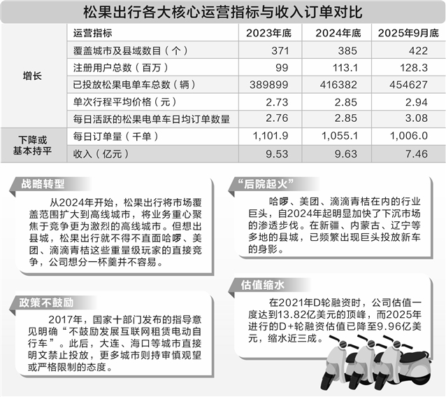 证券时报记者在广东部分城市的实地探访直观反映了这种困境。在高线城市的热门商圈,共享电单车点位早已被三大巨头的车辆密集覆盖,松果出行的车辆稀少且使用率低。一位梅州市区当地市民的反馈直言不讳:“平时主要骑美团、哈啰、滴滴青桔这些品牌的车最多,松果出行的车比较少,一般看到前面三个就直接骑了。”更重要的是,许多城市对共享电单车实施总量控制,后来者面临极高的准入壁垒。松果出行在招股书中也承认,向高线城市的战略调整导致了订单量波动,这直接解释了为何公司车辆投放持续增长,但总订单量却不升反降。