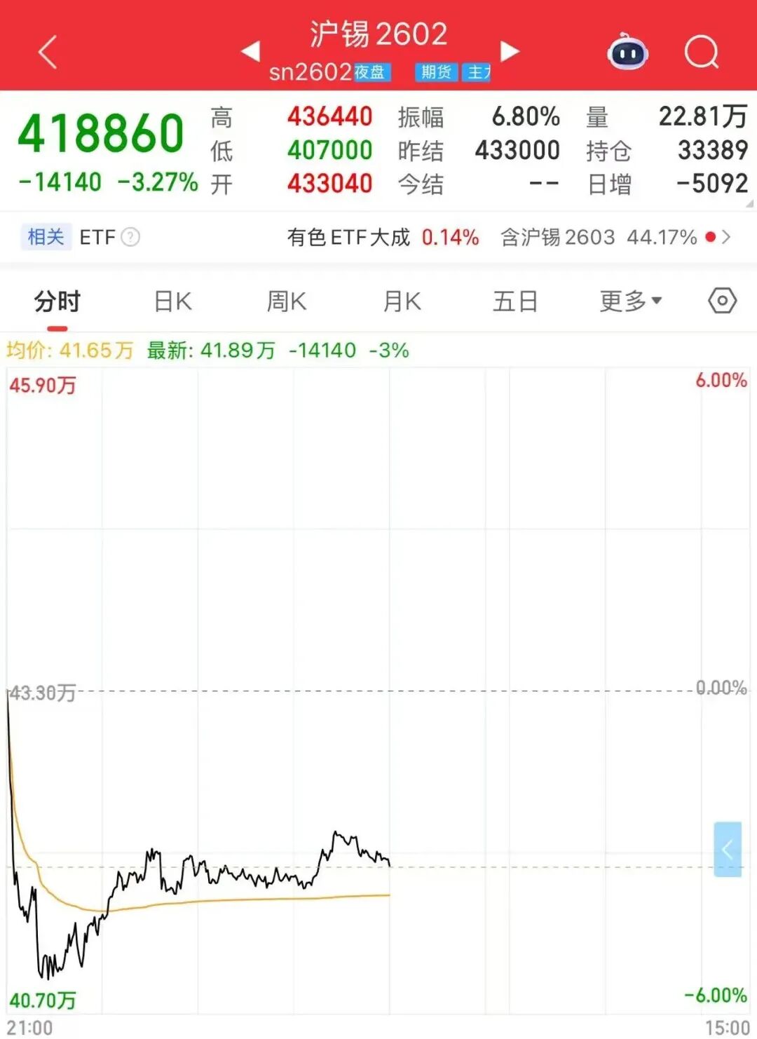 沪锡期货主力合约一度跌逾5%。伦锡期价跌逾4%。截至收盘,沪锡主力合约下跌3.27%。