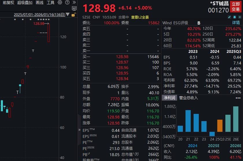 *ST铖昌(001270)今日开盘后秒速“地天板”,该股在停牌前的11个交易日内,收获10个涨停板,加上今日共收获11个涨停板。该股是近期商业航天概念的大牛股,公司曾在此前的异常波动公告中表示,商业航天行业处于产业初期阶段,低轨卫星星座的批量发射、组网进度及节奏尚存在不确定性,并于1月13日停牌核查,今日发布核查结果并复牌,公司表示,公司股票短期涨幅高于同期行业及上证涨幅,但公司基本面未发生重大变化,存在较大的交易风险。