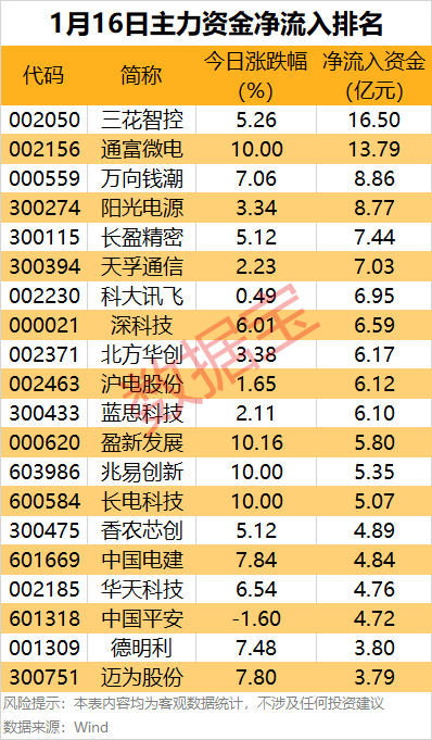 从个股来看,16股尾盘主力资金净流入金额均超7000万元,其中6股尾盘主力资金净流入均超1亿元。