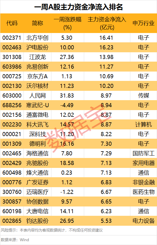 据证券时报·数据宝统计,本周(1月12日至16日),共计60股主力资金净流入额在3亿元以上。北方华创、沪电股份、江波龙主力资金净流入额排名前三,金额依次为16.41亿元、16.23亿元、13.98亿元;兆易创新、京东方A等股随后,主力资金净流入额均在10亿元以上。