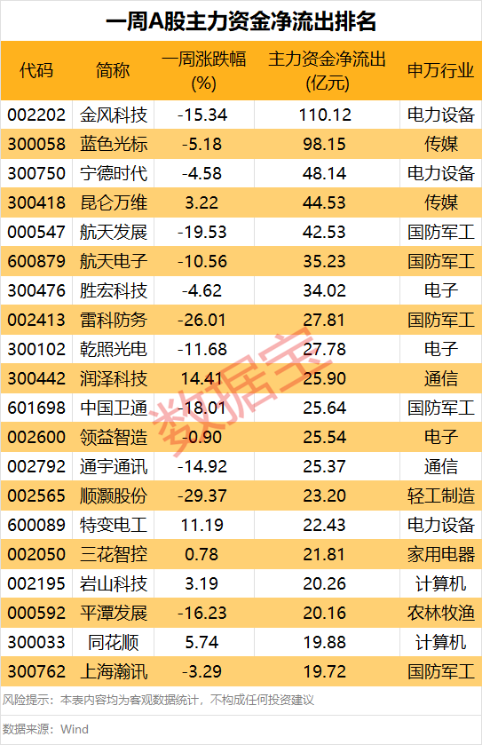 净流出方面,本周54股主力资金净流出额在10亿元以上。金风科技、蓝色光标分列第一、第二名,净流出额分别为110.12亿元、98.15亿元;宁德时代、昆仑万维、航天发展随后,主力资金净流出额均超过40亿元。