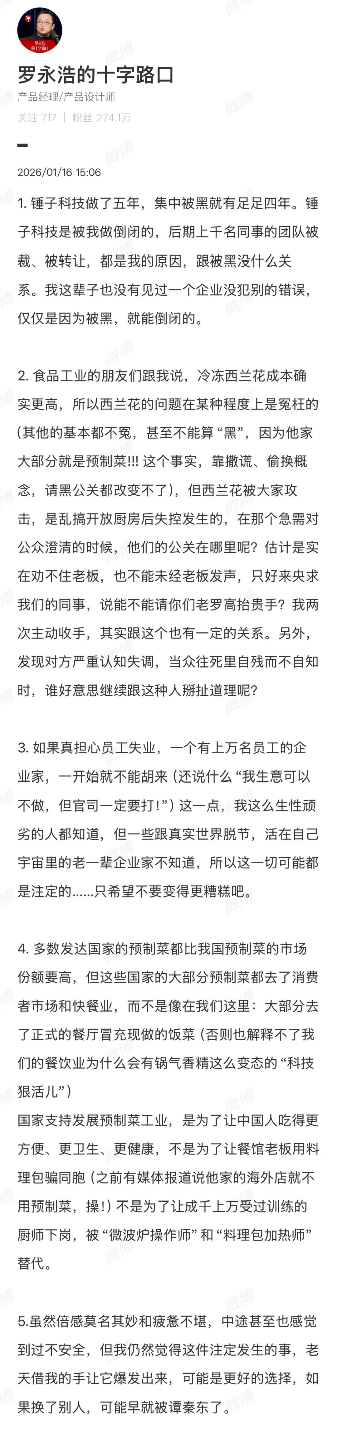 在今日(1月16日)罗永浩的回应中,他亦表示,“食品工业的朋友们跟我说,冷冻西兰花成本确实更高,所以西兰花的问题在某种程度上是冤枉的”。不过,罗永浩认为,他吐槽的其他的基本都不冤,甚至不能算“黑”。