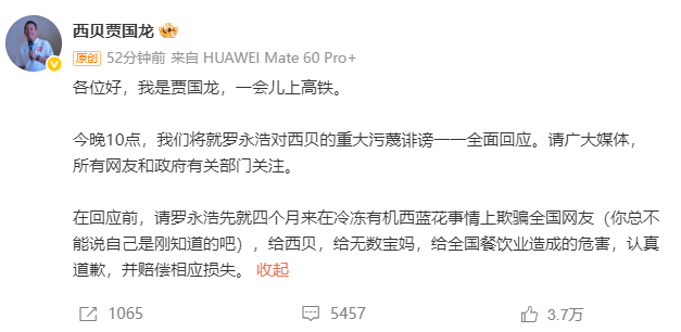 随后,西贝餐饮创始人贾国龙在微博发文称,将于今晚10点将就罗永浩对西贝的重大污蔑诽谤一一全面回应。“在回应前,请罗永浩先就四个月来在冷冻有机西蓝花事情上欺骗全国网友(你总不能说自己是刚知道的吧),给西贝,给无数宝妈,给全国餐饮业造成的危害,认真道歉,并赔偿相应损失。”