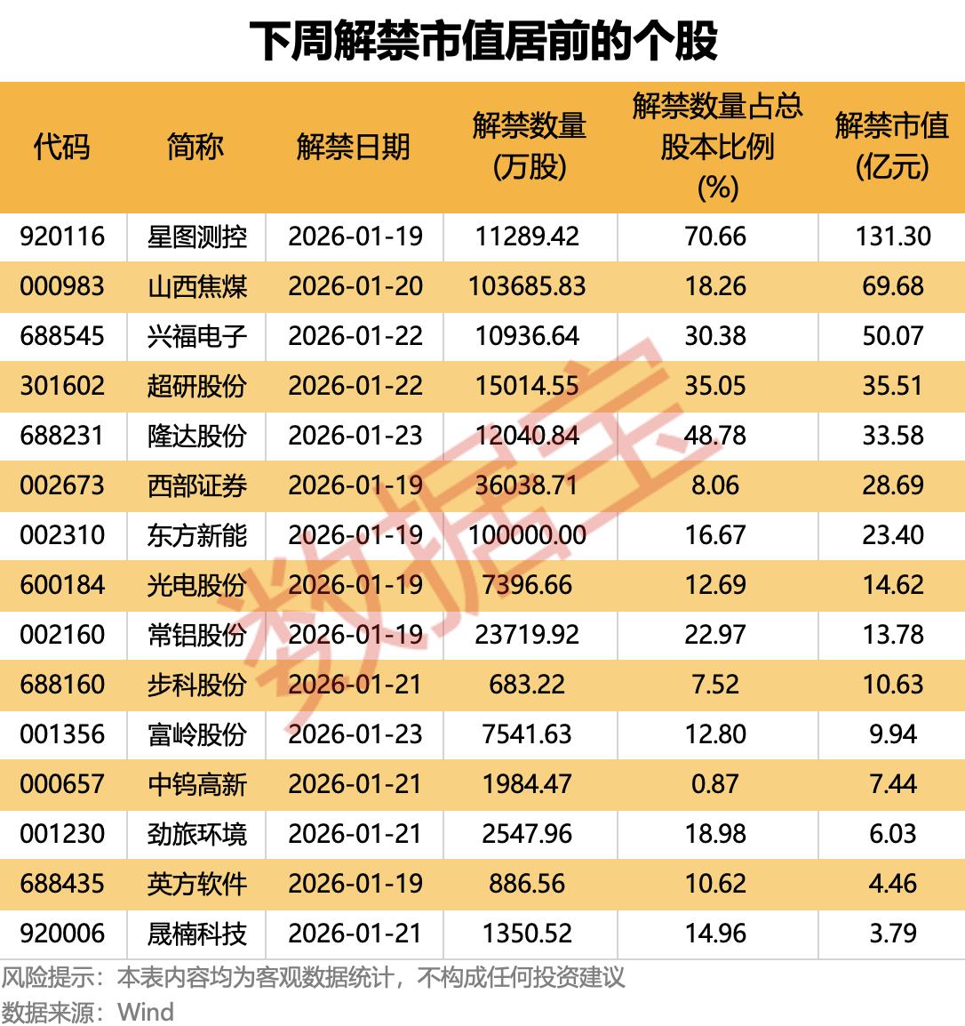 5只个股解禁市值均超30亿元。其中星图测控解禁市值最高,下周将有1.23亿股上市流通,占公司总股本70.66%,可交易时间为1月19日。