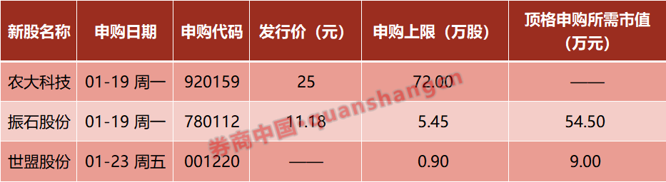 本周(1月19日—1月23日)有3只新股发行,周一:农大科技、振石股份;周五:世盟股份。