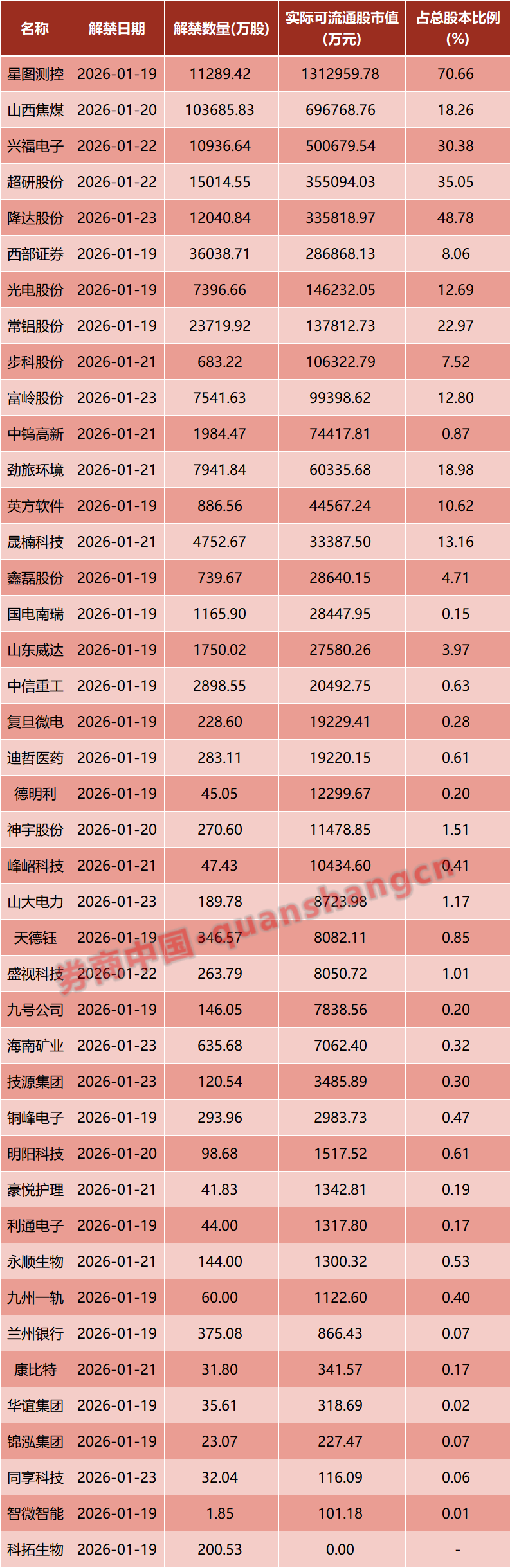从解禁占比来看,解禁占比居前三位的是:星图测控(70.66%)、隆达股份(48.78%)、超研股份(35.05%)。