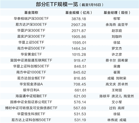 截至1月16日,全部上市ETF总规模为6.07万亿元。其中,华夏基金旗下ETF总规模于1月12日突破万亿元,后因市场调整下降至9648.17亿元。位列其后的分别是易方达基金(8586亿元)、华泰柏瑞基金(5962.65亿元)、南方基金(4347.42亿元)、嘉实基金(3720.17亿元),前五强总规模占比达到了53.21%。