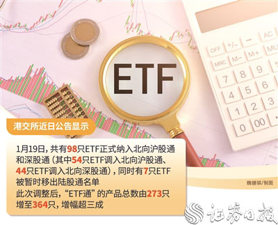 港交所近日发布公告,1月19日,共有98只ETF正式纳入北向沪股通和深股通(其中54只ETF调入北向沪股通、44只ETF调入北向深股通),同时有7只ETF被暂时移出陆股通名单。此次调整后,“ETF通”的产品总数由273只增至364只,增幅超三成。