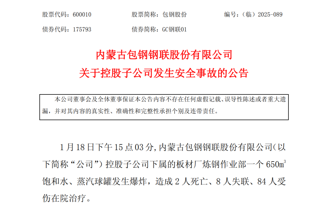 1月19日盘前,包钢股份(600010)发布公告,通报控股子公司发生安全事故。