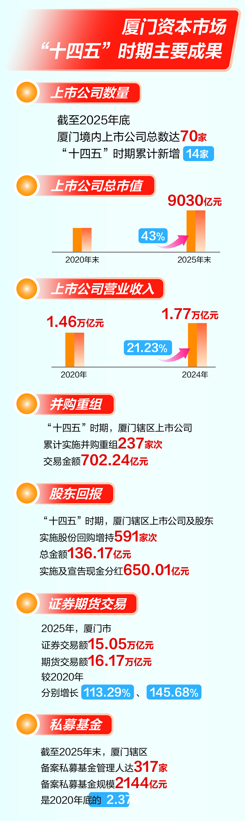 “十四五”时期,厦门资本市场呈现全面提速的发展态势。企业上市方面,累计新增A股上市公司14家,截至2025年底,境内上市公司总数达70家,占全省近四成,涵盖主板43家、创业板21家、科创板5家、北交所1家,总市值突破9030亿元,较2020年底增长43%。证券期货基金机构布局持续优化,现有证券公司、期货公司、基金公司各2家,证券期货分支机构184家,金融中介机构密度位居全国前列。