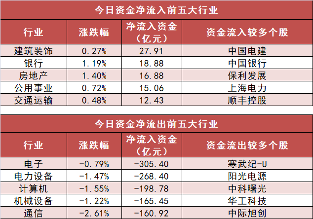 申万一级行业中,8个行业实现资金净流入,其中建筑装饰行业净流入27.91亿元居首。