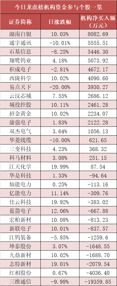盘后龙虎榜数据显示,机构现身多股,其中湖南白银等股票呈现机构资金净买入,三维通信等股票呈现机构资金净卖出。