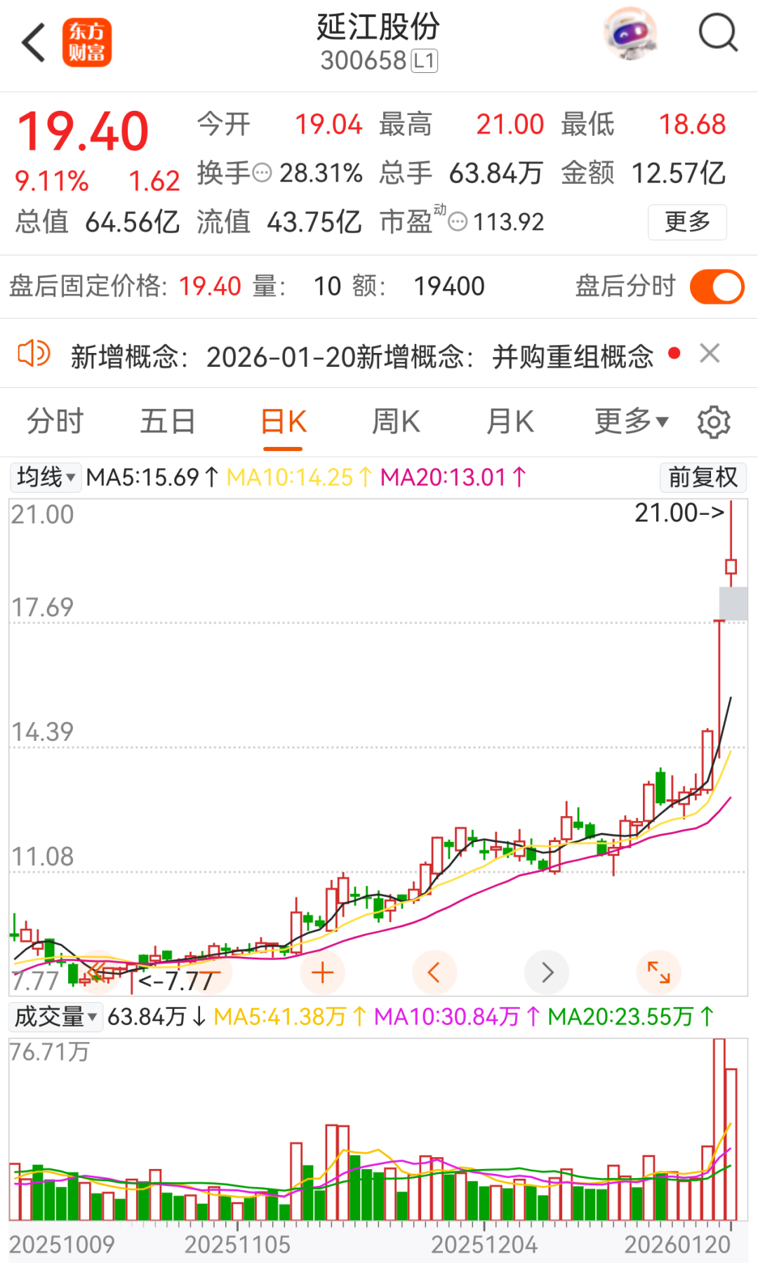 受此影响,延江股份1月19日复牌后,股价收获20%涨停;1月20日,延江股份再涨9.11%。