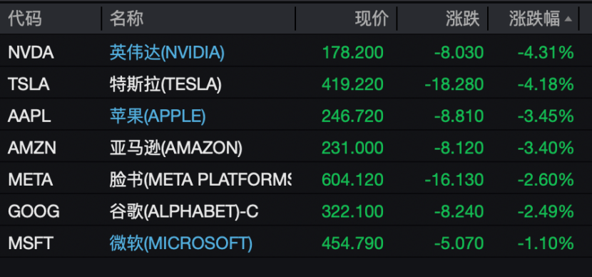美股大型科技股全线下跌,其中英伟达、特斯拉两大龙头股均重挫,跌幅均超过4%,另外,苹果、亚马逊均跌逾3%,Meta、谷歌均跌逾2%,微软跌超1%。