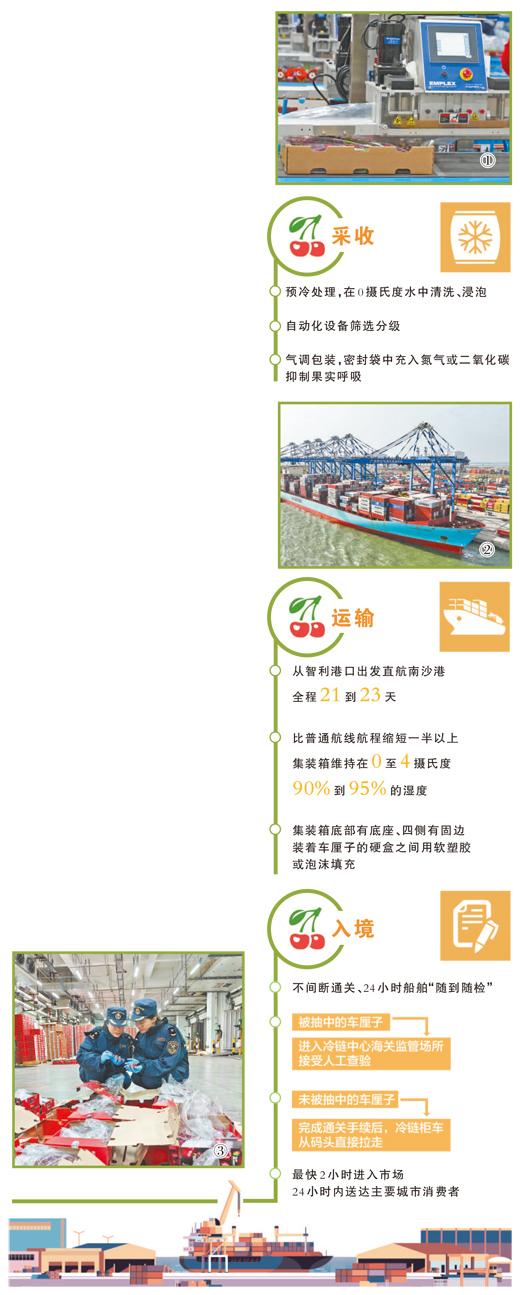 经预冷、“休眠”的车厘子,果心温度降至1摄氏度左右,随即每5斤一盒包装完毕,再逐盒整齐地码入自带空调压缩机的集装箱,在全程冷链中完成接下来的“漂洋过海”。“装箱时,智利相关农业监管部门会派人在现场核验贴绿标,这是依据中智双边签订的检验检疫议定书开展的监管行为,既确保中国消费者‘舌尖上的安全’,又能提升到港后的海关查验效能。”广州海关所属南沙海关副关长陈荣溢表示。