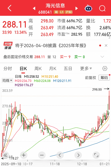 人民财讯1月21日电,1月21日,海光信息(688041)收盘上涨13.34%,最新股价报收288.11元/股,创下历史新高。该股于1月20日反超寒武纪,成为半导体行业A股市值最高的股票。
