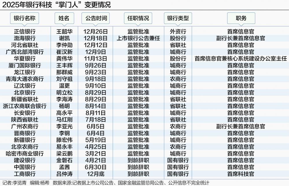 据21世纪经济报道记者不完全统计,2025年有22家银行科技“一把手”出现变更。