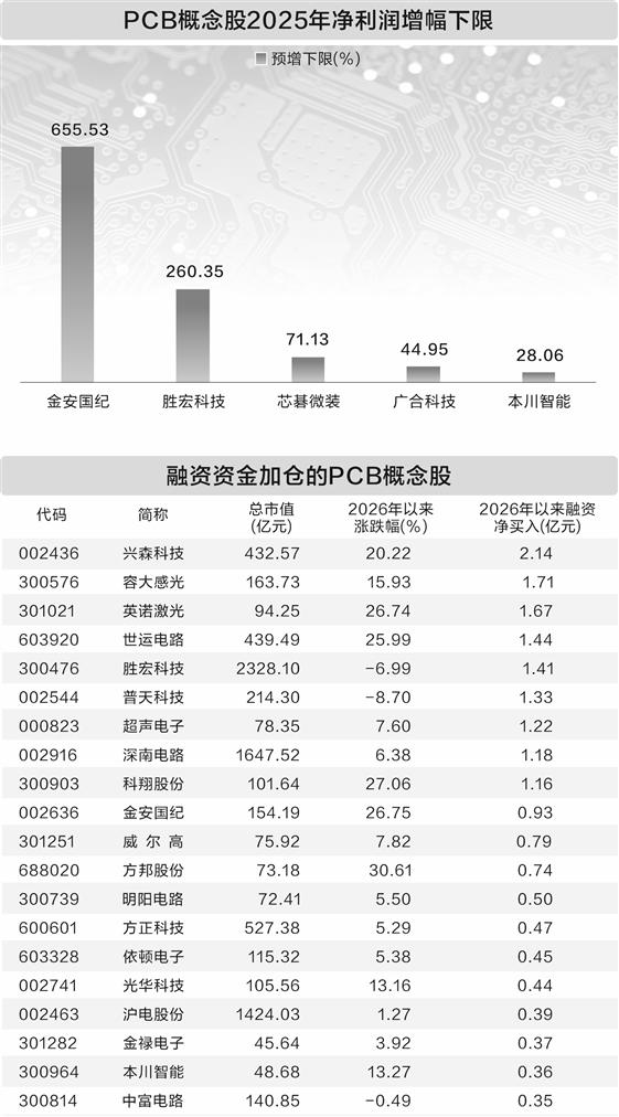 随着行情持续向好,PCB板块获得资金青睐。据数据宝统计,截至1月20日,2026年以来PCB概念股合计获融资净买入16.74亿元,其中9股获净买入金额超过1亿元,兴森科技、容大感光、英诺激光居前,分别达到2.14亿元、1.71亿元、1.67亿元。