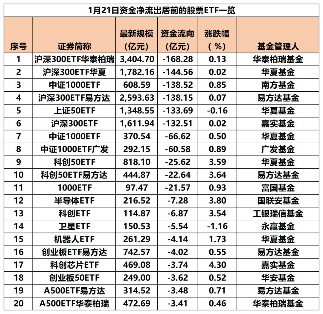 1月21日,A股主要指数集体收涨,贵金属、采掘行业等板块涨幅居前。股票ETF资金净流出超990亿元,沪深300ETF、中证1000ETF等宽基ETF成为“失血”大户,合计净流出超千亿元,此外,电网设备、化工、黄金、半导体等热门主题ETF资金净流入居前。
