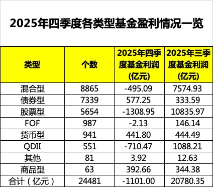 面对这样的市场环境,公募基金“赚钱效应”有所削减。天相投顾数据显示,2025年第四季度公募基金整体亏损达1101亿元,固收类品种实现正利润,权益类基金成为亏损主阵营。