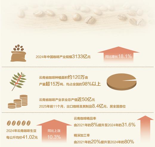 数据显示,2024年中国咖啡产业规模3133亿元,同比增长18.1%。随着国内咖啡消费市场升温,许多消费者慕名来到云南。云南乘势推动一二三产融合发展新模式,全省建成精品咖啡庄园近60个,打造一批“咖啡+”消费新场景,提升云南咖啡知名度和影响力。
