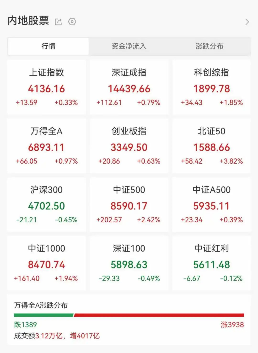 今日(1月23日),A股全天窄幅震荡,三大指数集体上涨。截至收盘,沪指小幅上涨0.33%,最新报4136.16点;深证成指上涨0.79%,创业板指上涨0.63%。市场全天成交31181.08亿元,较昨日放量4017.03亿元。