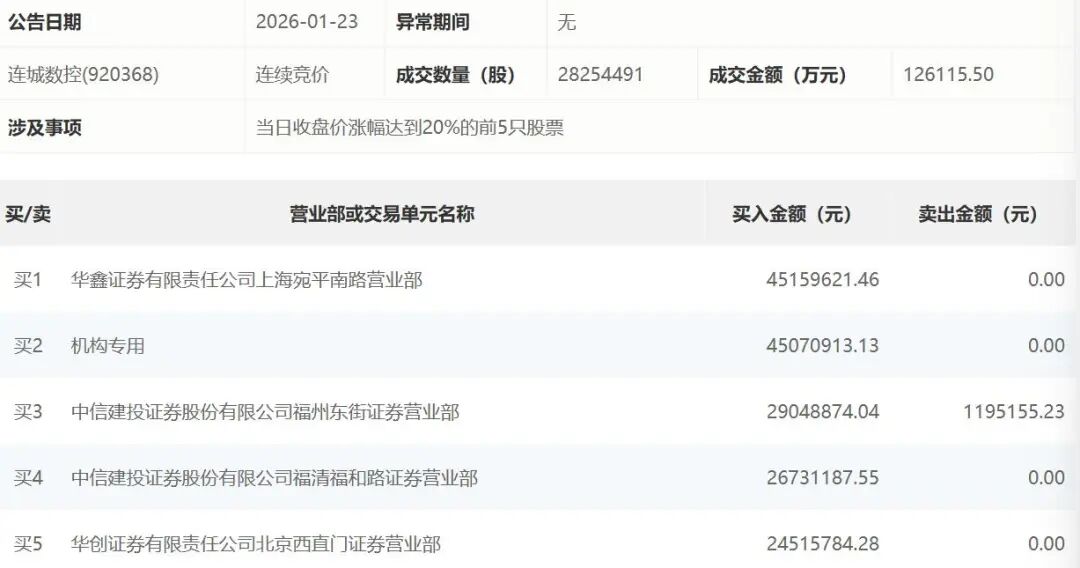 据北交所今日盘后披露,连城数控的买入榜一为华鑫证券有限责任公司上海宛平南路营业部,合计买入4516万元;榜二为机构专用席位,该机构今日共买入4507万元。买入榜前两位今日卖出金额均为0。