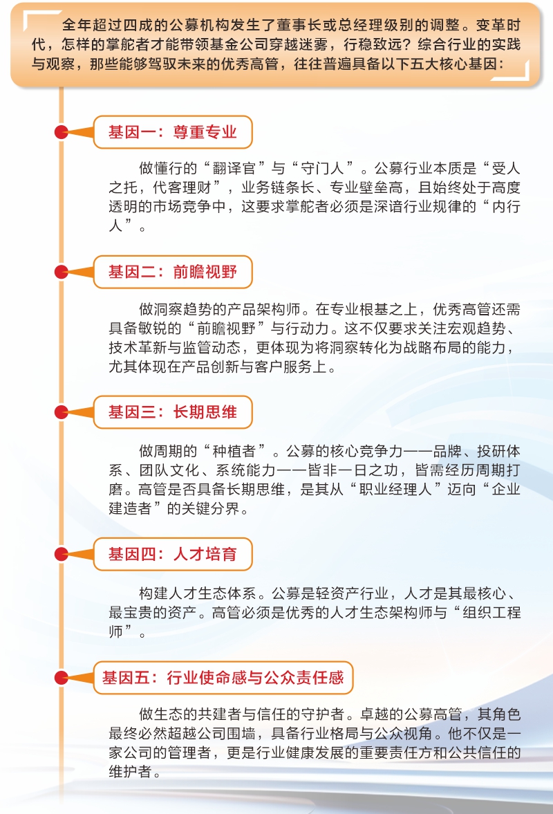 基因五:行业使命感与公众责任感——做生态的共建者与信任的守护者。卓越的公募高管,其角色最终必然超越公司围墙,具备行业格局与公众视角。他不仅是一家公司的管理者,更是行业健康发展的重要责任方和公共信任的维护者。
