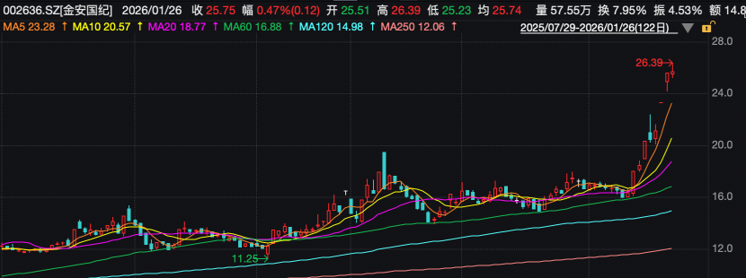 金安国纪今天上午继续上行,2026年以来,公司股价涨幅已经超过50%。