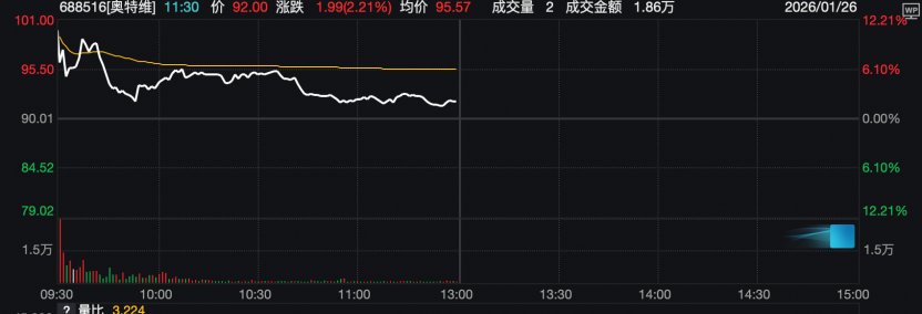 奥特维今天上午继续上行,盘中涨幅超过12%,后涨幅有所收窄。2026年以来,公司股价涨幅已经超过100%。