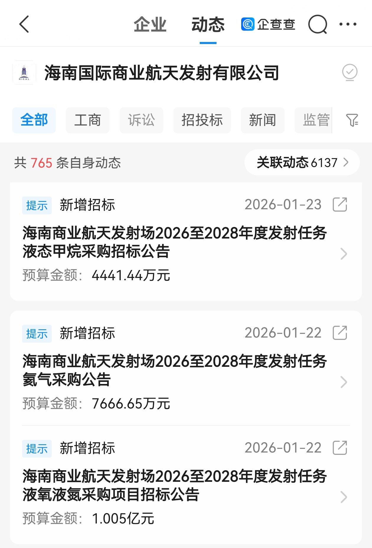人民财讯1月26日电,企查查APP显示,海南国际商业航天发射有限公司新增多项招标公告,招标项目为海南商业航天发射场2026至2028年度发射任务液态甲烷、氦气、液氧液氮采购,合计预算金额约2.2亿元。企查查信息显示,该公司成立于2022年,注册资本15亿元,经营范围包含:民用航天发射技术服务;微小卫星测运控服务;火箭发射设备研发和制造等。1月19日,在海南商业航天发射场,长征十二号运载火箭成功将卫星互联网低轨19组卫星送入预定轨道。