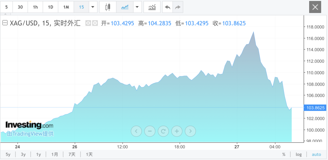 贵金属市场上演巨震,现货白银价格日内一度大涨超14%,但在美股收盘后不久,现货白银几乎回吐了当天全部涨幅,随后仅出现非常有限的反弹,当日最终涨幅不到1%。