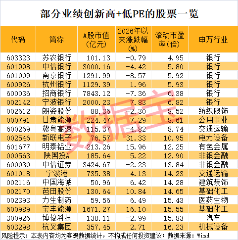 估值水平方面,截至1月26日收盘,这158只业绩创新高的股票中,66股滚动市盈率(PE)低于30倍。其中9股滚动市盈率不到10倍,包括苏农银行、中信银行、南京银行、杭州银行、招商银行、宁波银行等多只银行股,以及朗姿股份、甘肃能源、赣粤高速等。