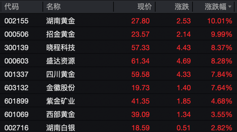 A股贵金属概念股再度集体大涨,晓程科技盘中涨幅超过14%,后有所收窄,湖南黄金、招金黄金、中国黄金等涨停,白银有色盘中一度涨停,另有多股跟涨。