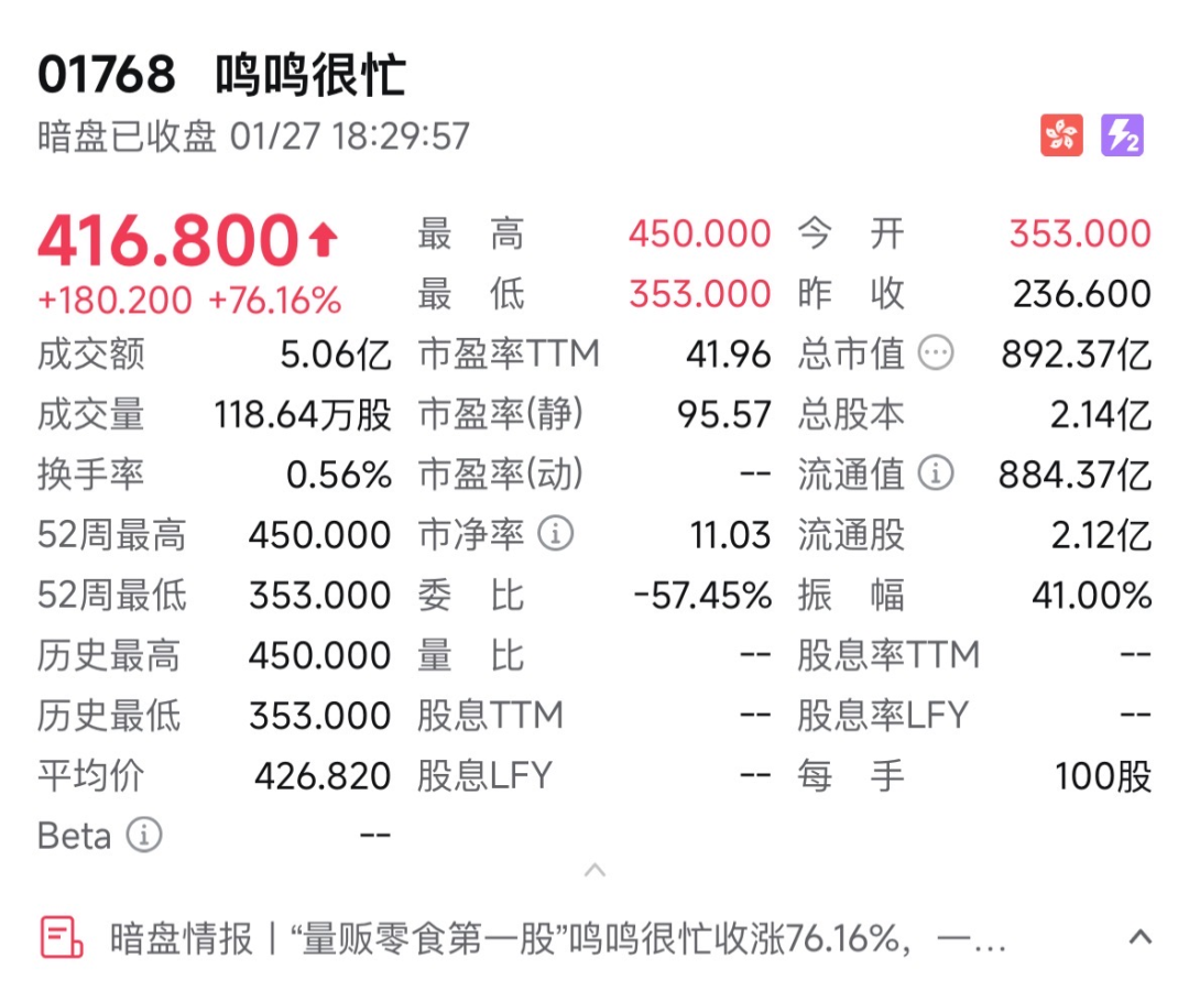 1月27日晚间,即将在28日上市的港股新股鸣鸣很忙进入暗盘时间,富途牛牛显示,鸣鸣很忙暗盘涨幅超过76%,其间市值一度逼近千亿港元,不计手续费,中签一手大赚超1.8万港元。